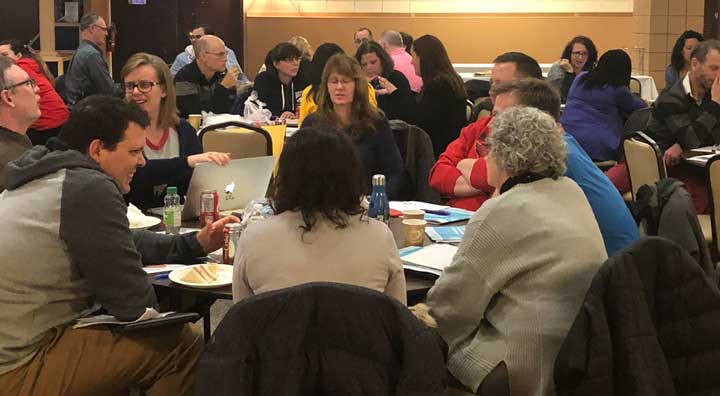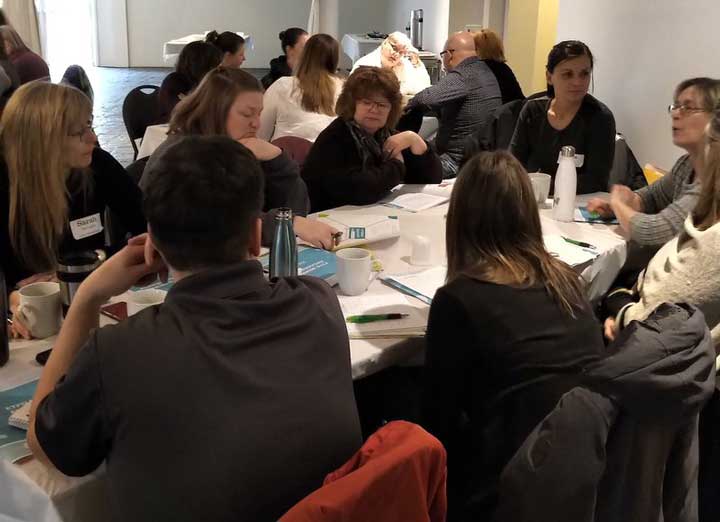March 21: Members and stewards from the Bluewater Teacher and Occasional Teacher Locals discuss tactics to fight the Ford government’s cuts to public education. (Photo thanks to Nancy Lawler)