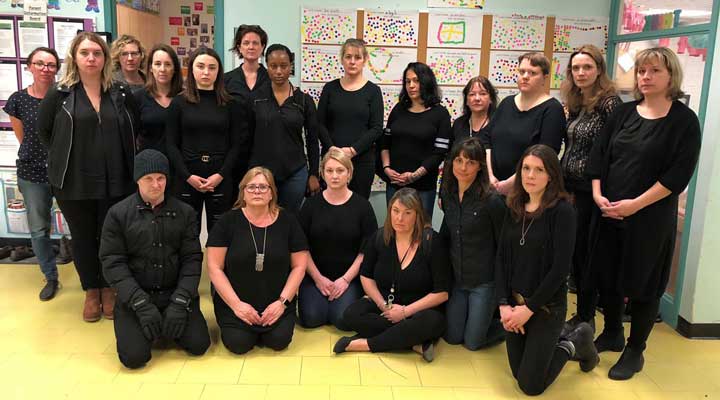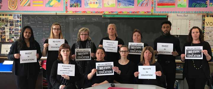 March 22: Three photos above: ETFO’s Elementary Teachers of Toronto tweeted: “Wearing black to mourn @fordnation’s cuts – a loss of quality in our world-class public education system. ETT will always fight for our public schools; our students and teachers deserve safer and supportive learning environments.” (Photos thanks to Elementary Teachers of Toronto)