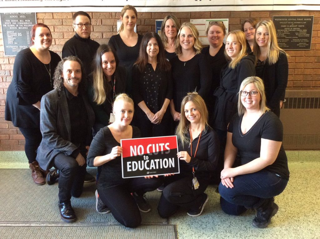 March 18: Members of ETFO’s Thames Valley Teacher Local and Thames Valley Occasional Teacher Local joined members of CUPE Locals 7575 and 4222 to stand in solidarity against the Ford government’s cuts to education. (Photo thanks to Shawn Crowell)