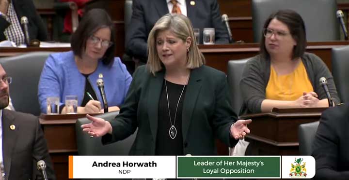 Ontario NDP Leader Andrea Horwath asks a question in the legislature to Premier Doug Ford on April 15. Ford answered that teachers were “so happy” with the education cutbacks in his government’s budget.