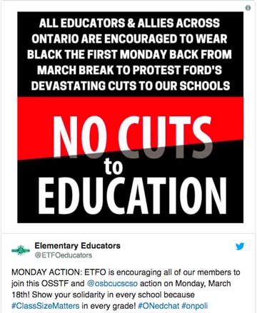 ETFO urged members to join high school teachers in wearing black to school on Monday to protest the latest Ford government cuts.